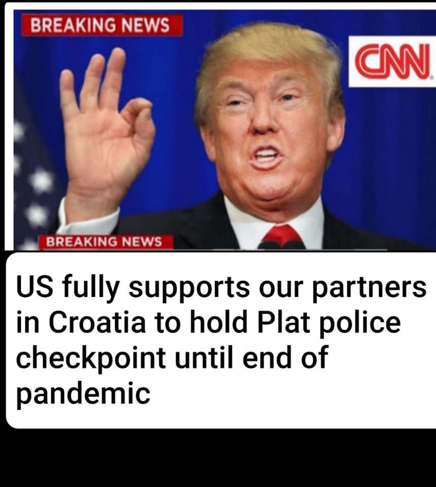 uz ovu fotomontažu konavoski načelnik objavio je još jednu američkog predsjednika Donalda Trumpa koji poručuje; "United States u potpunosti podržava naše partnere u Hrvatskoj da drže kontrolni punkt Plat do kraja pandemije".