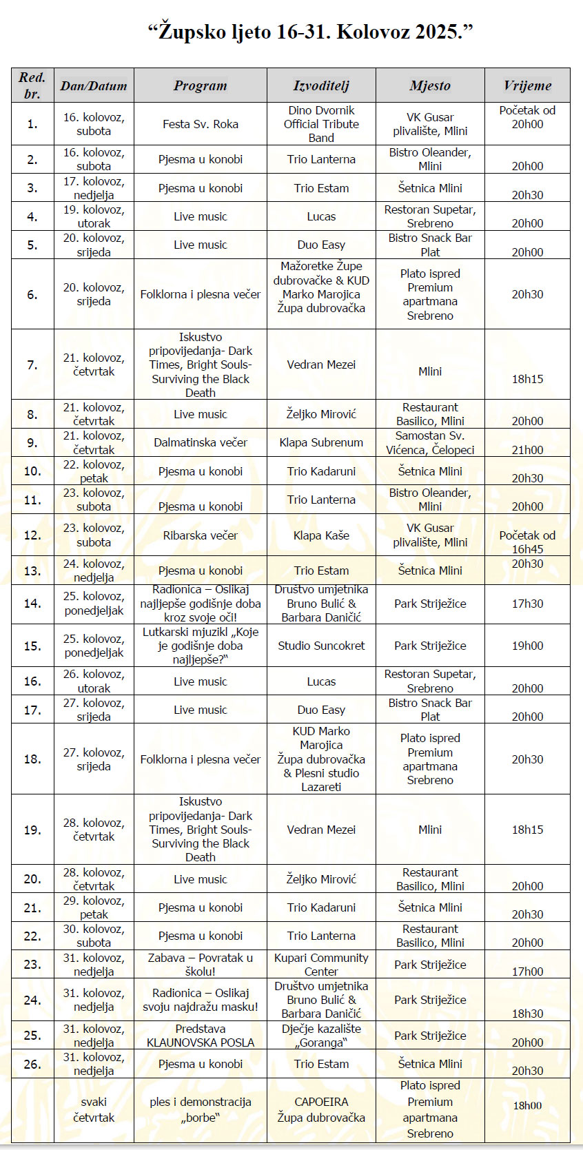 Uz uobičajene klapske i folklorne nastupe, pjesme u konobi i live music kroz Mline i Srebreno te iskustvo pripovijedanja pod Platanom, program Župskog ljeta u prvom djelu kolovoza donosi još dvije radionice Društva umjetnika Bruno Bulić i Barbare Daničić te predstavu Dječjeg kazališta „Goranga“. Studio Suncokret će 25. kolovoza u Parku Striježice izvesti Lutkarski mjuzikl „Koje je godišnje doba najljepše?“.