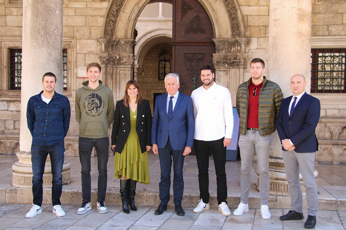 Župan Nikola Dobroslavić, s pročelnicom Jelenom Dadić Račić i predsjednikom Zajednice sporta Dubrovačko-neretvanske županije Blažom Pezom, primio je danas u palači Ranjina Marka Bijača, Lorena Fatovića, Marka Žuvelu i Filipa Kržića-hrvatske reprezentativce koji su osvojili zlatnu medalju na Svjetskom prvenstvu u vaterpolu održanom u Dohi.