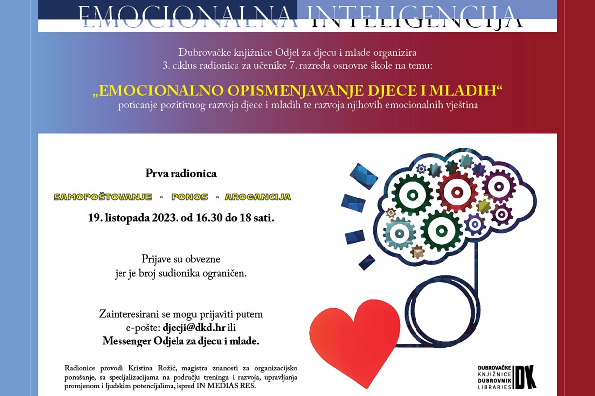 Odjel za djecu i mlade Dubrovačkih knjižnica organizira treći ciklus besplatnih radionica za učenike 7. razreda osnovnih škola na temu „Emocionalno opismenjavanje djece i mladih“ - poticanje pozitivnog razvoja djece i mladih te razvoja njihovih emocionalnih vještina. Radionice će se održavati u prostorijama Dubrovačkih knjižnica (Narodna knjižnica Grad, Od Puča 6) jednom mjesečno. Prva, od osam, radionica će se održati u četvrtak, 19. listopada 2023., s početkom u 16:30 sati u prizemlju Narodne knjižnice Grad, tema je ''samopoštovanje - ponos - arogancija''.