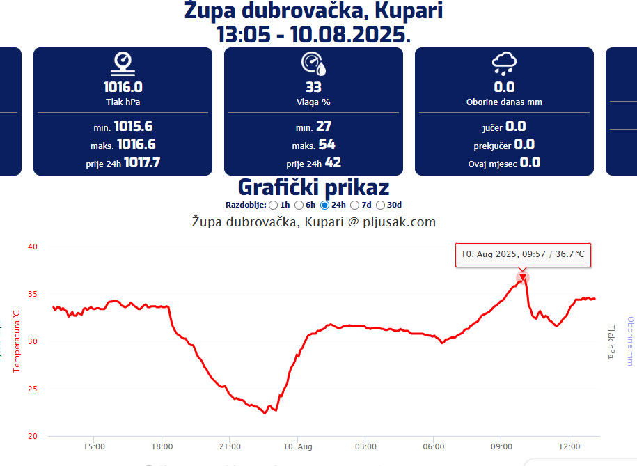 Automatska meteorološka postaja u Kuparima jutros u 09:57 je izmjerila 36.7°C, dok je najveća današnja temperatura na Automatskoj meteorološkoj postaji Martinovići u 10:19 bila 37.1°C.