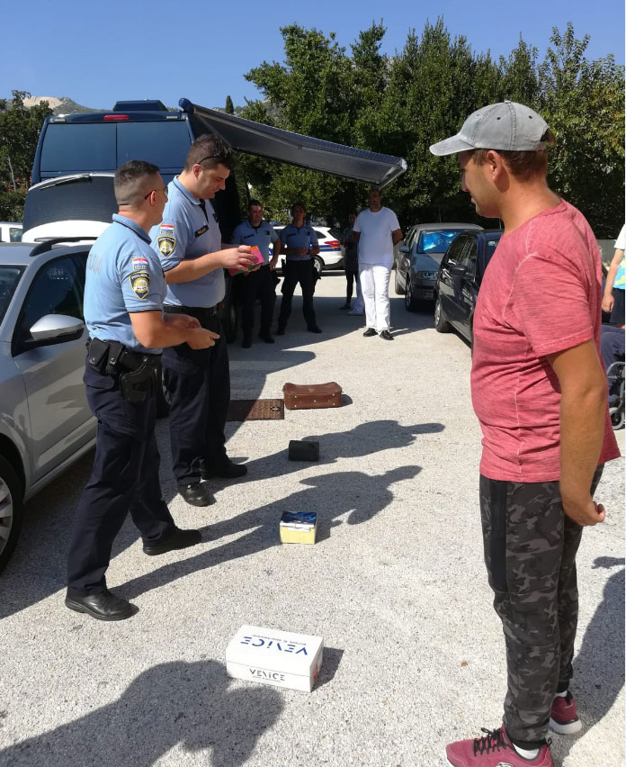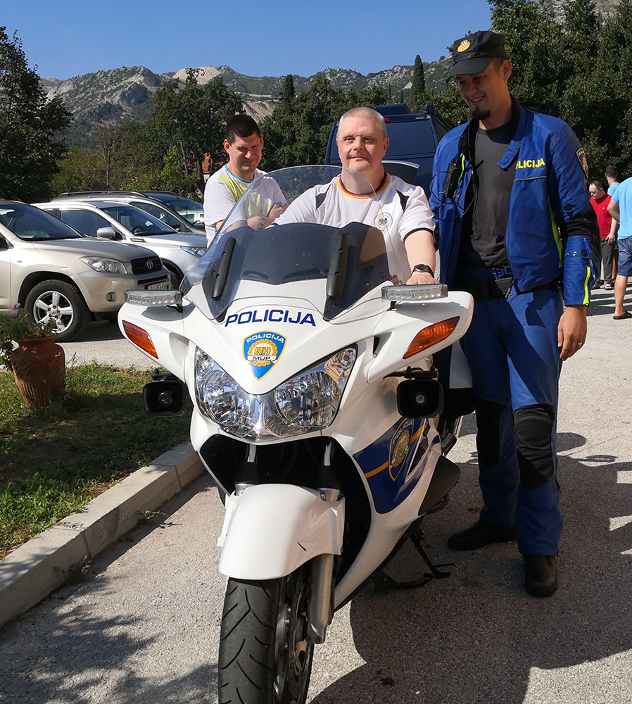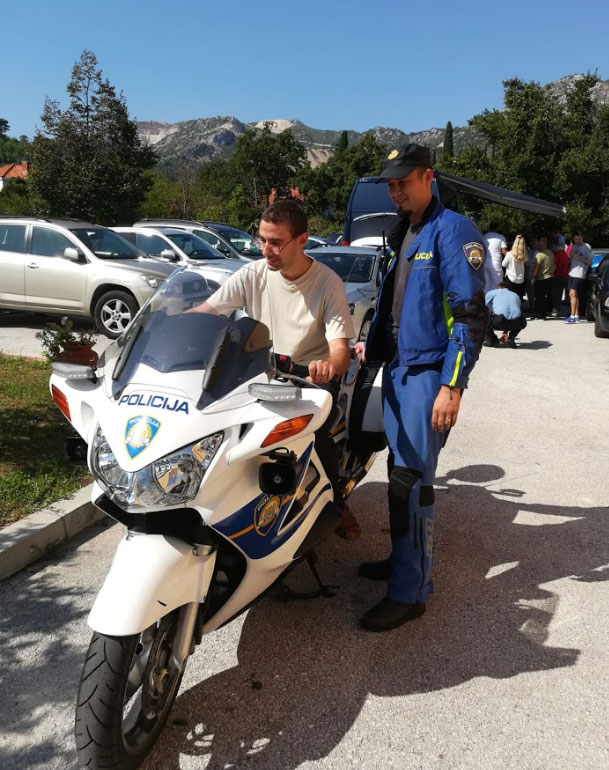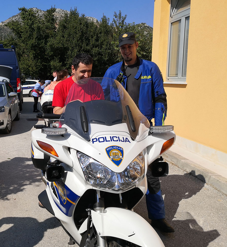 Načelnik Postaje granične policije Gruda, gospodin Matko Klarić je zajedno sa svojim kolegama predstavio pojedine rodove policije i omogućio da svaki korisnik sudjeluje u vježbama koje su pripremili za demonstraciju. Pomoćnik načelnika Marko Čuvalo pojasnio je zaduženja svakog policajca a potom su odradili nekoliko vježbi u koje su uključili i korisnike. Policajac motorista Nenad Kišiček je svakom korisniku koji je želio sjesti na motor omogućio poseban doživljaj. Službenici za zaštitu granica Marko Mohač i Saša Trifunović su upoznali korisnike sa Schengen busom i njegovom opremom dok je vježbu za detekciju droge sa službenim psom Molly korisnicima prikazao Mario Žigić. Svaki korisnik je radosno pristupio vježbama, dok su pojedini isprobavali motor, drugi su sjeli u službeni policijski auto, a poneki su učili stavljati balističke prsluke i kacige. Nakon prezentacije djelatnici Postaje granične policije Gruda su korisnike darovali slikovnicama i bojankama.