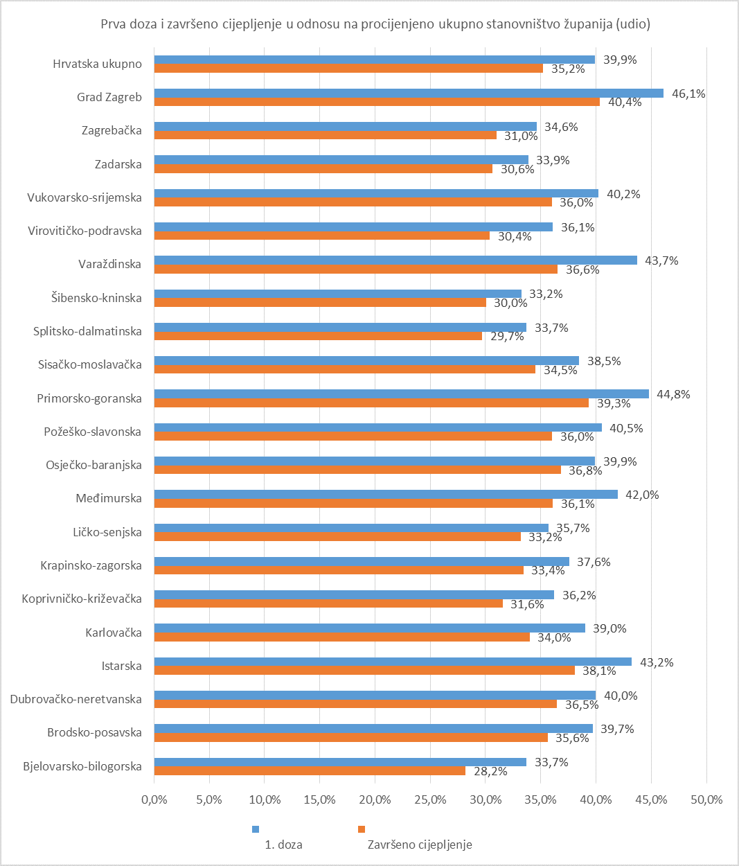 Najveći obuhvat cijepljenih prvom dozom postignut je u Gradu Zagrebu (46,1 posto ukupnog stanovništva, odnosno 55,8 posto odraslog stanovništva), a završeno cijepljenje u najvećem je obuhvatu ostvareno također u Gradu Zagrebu (40,4 posto ukupnog, odnosno 48,9 posto odraslog stanovništva).