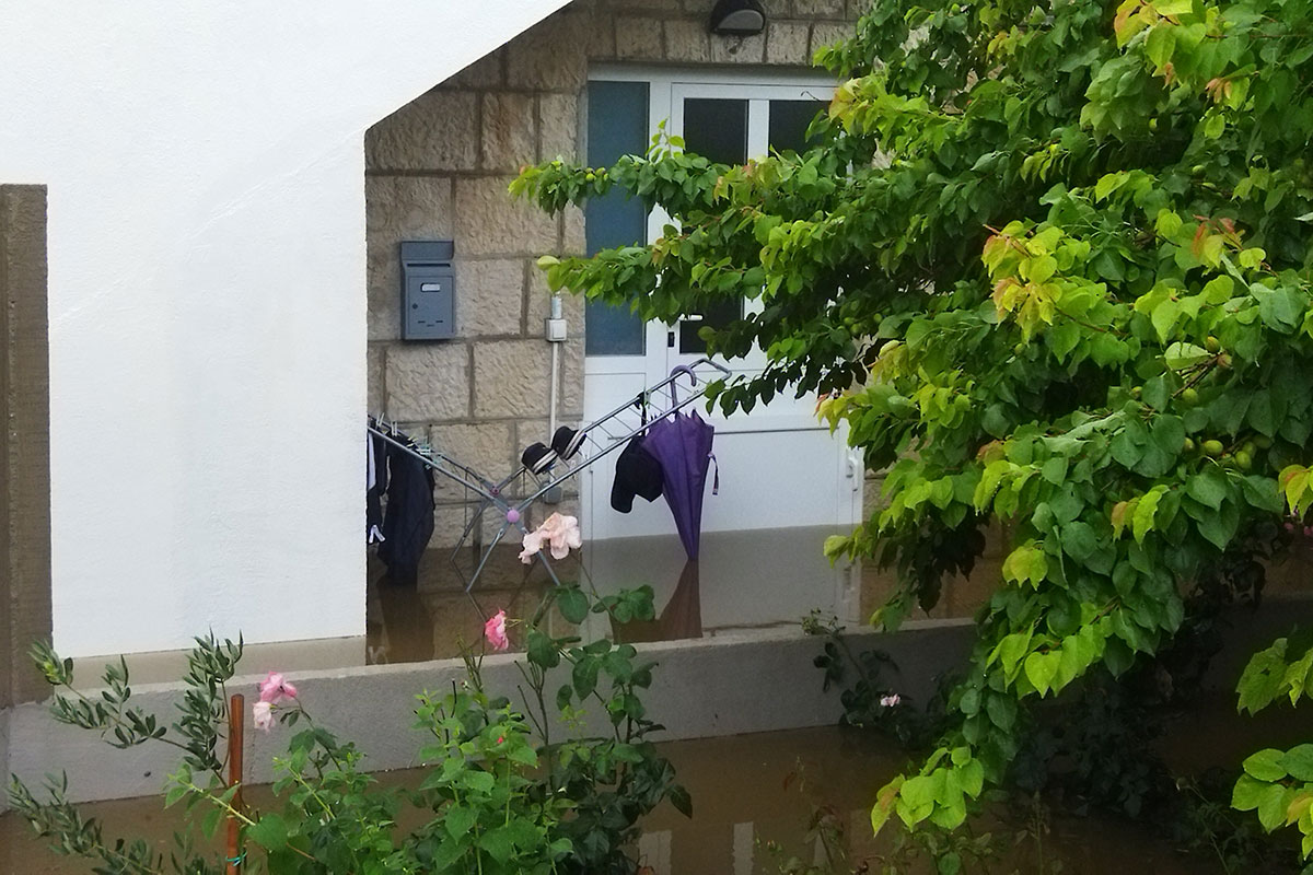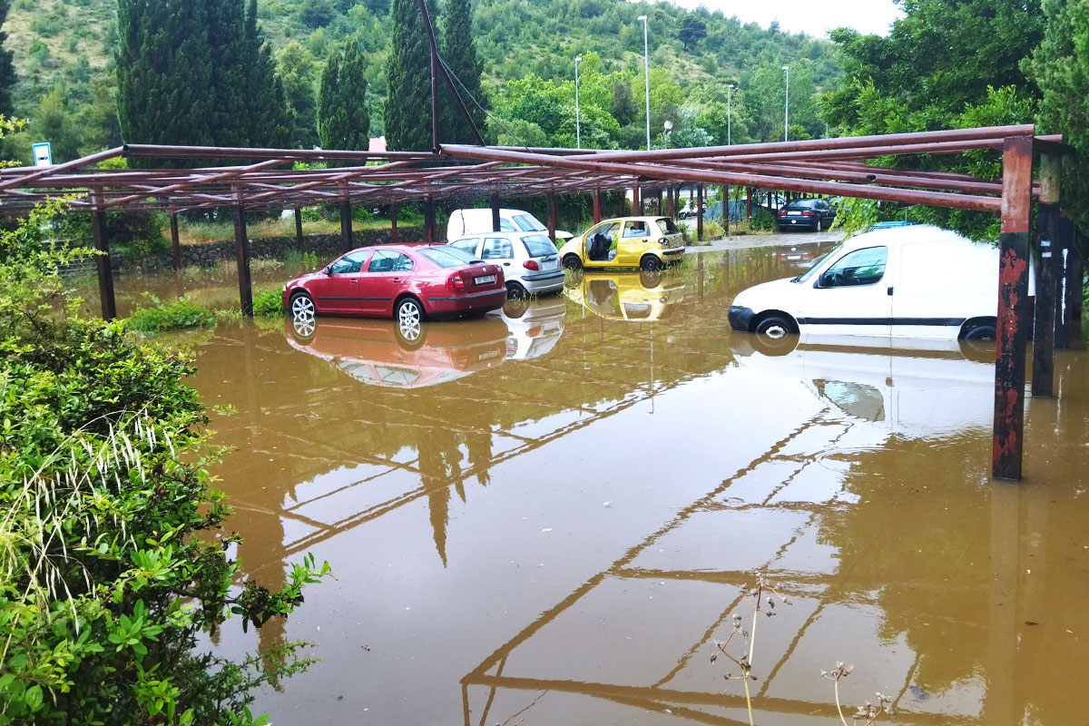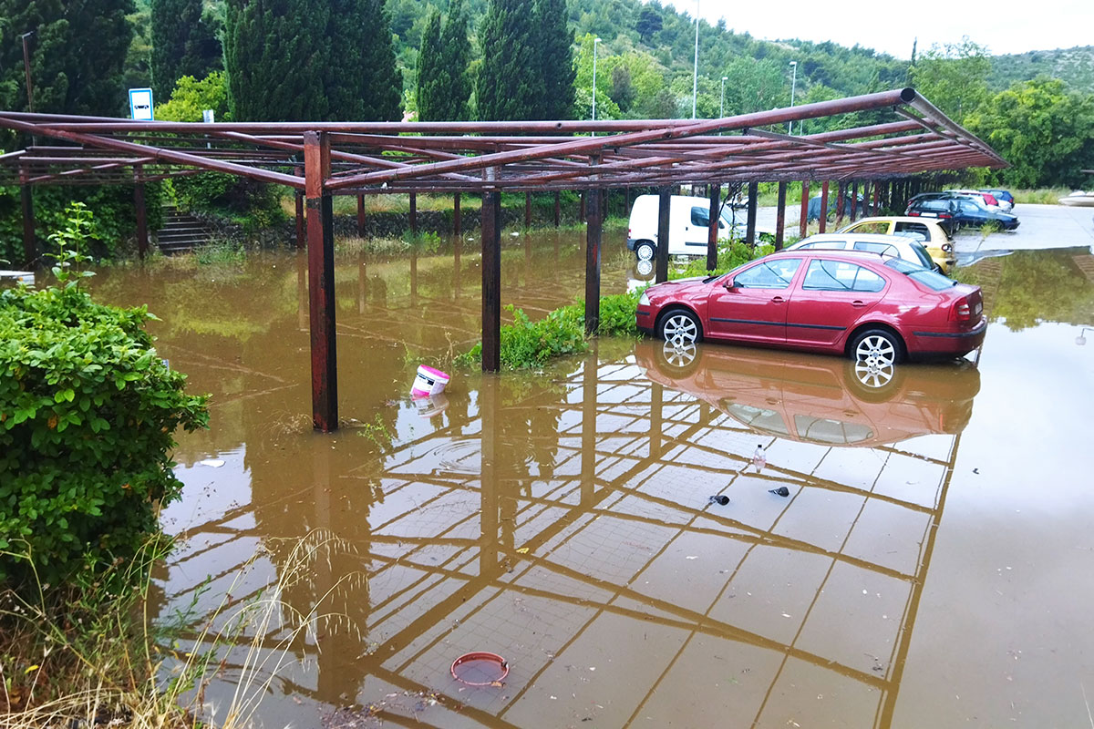 Kamenu zgradu i okolne kuće, parkiralište, vozila i ceste sjeverno od magistrale u Kuparima u ranim popodnevnim satima nakon dužeg vremena ponovo su poplavile oborinske vode. Današnja obilna kiša se po količini oborina u kratkom vremenu može mjeriti samo s onom koja je uzrokovala veliku poplavu u rujnu 2014. godine, ali zahvaljujući radovima izvršenim nakon te poplave, poslijedice su puno manje.