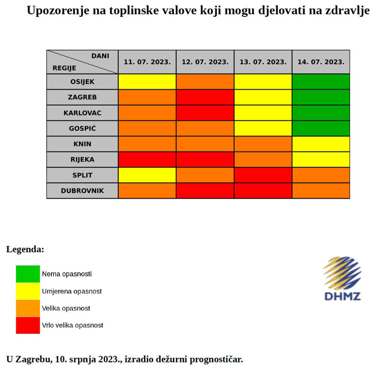 Za Dubrovačko-neretvansku županiju za srijedu 12. i četvrtak 13. srpnja prognozirana je vrlo velika opasnost od pojave toplinskog vala, dok za utorak 11. i petak 14. srpnja 2023. prognozirana je velika opasnost od pojave toplinskog vala.