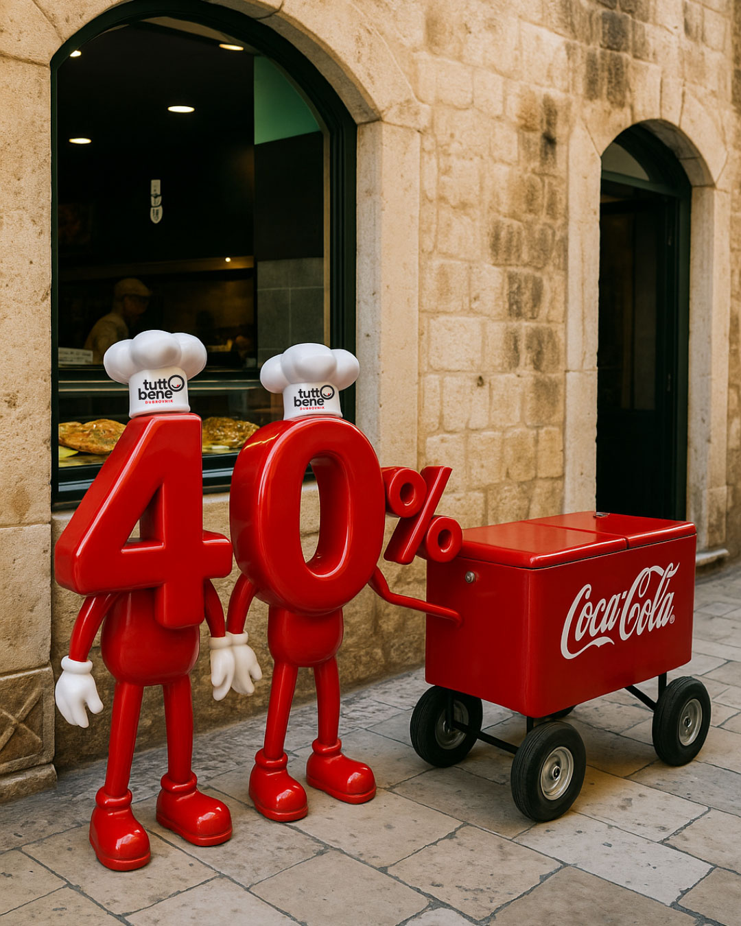 Simpatični crveni likovi u obliku brojeva “40%”, s kuharskim kapama i osmijehom, simboliziraju popuste koji su “krenuli u đir” po gradu i svratili tamo gdje su uvijek dobrodošli — u TuttoBene.