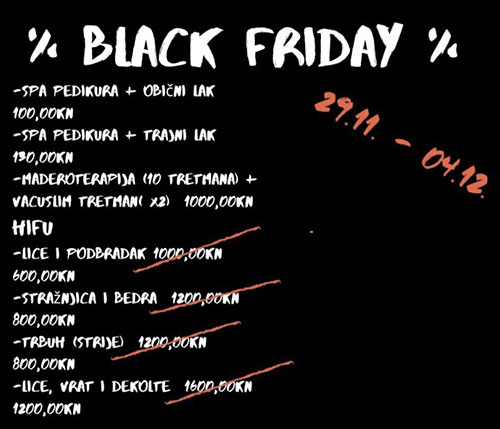 I u Hrvatskoj je posljednjih godina zaživio Black Friday ili Crni petak, dan kada rastu popusti, a padaju cijene. Prepoznao je to i Vaš omiljeni beauty salon - Šminkeraj. U periodu od 29.11. pa do 4.12. pripremili su za Vas pregršt popusta na tretmane ljepote, od čega svakako izdvajamo HIFU - tretman za lice, temeljen na ultrazvučnoj dijagnostici koji zateže kožu lica, vrata i dekoltea, kao i tretman za tijelo koji uklanja tvrdokornu masnoću, celulit i strije. Uz navedene, na raspolaganju Vam je još mnoštvo tretmana poput maderoterapije i pedikure kako biste zablistali pred nadolazeće blagdane.