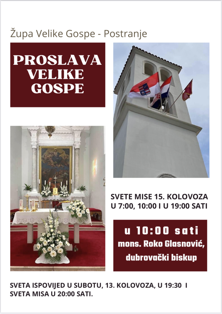 Župa Velike Gospe u Postranju 15. kolovoza slavi svoju nebesku zaštitnicu. Svečano euharistijsko slavlje u 10 sati predslavit će dubrovački biskup mons. Roko Glasnović.