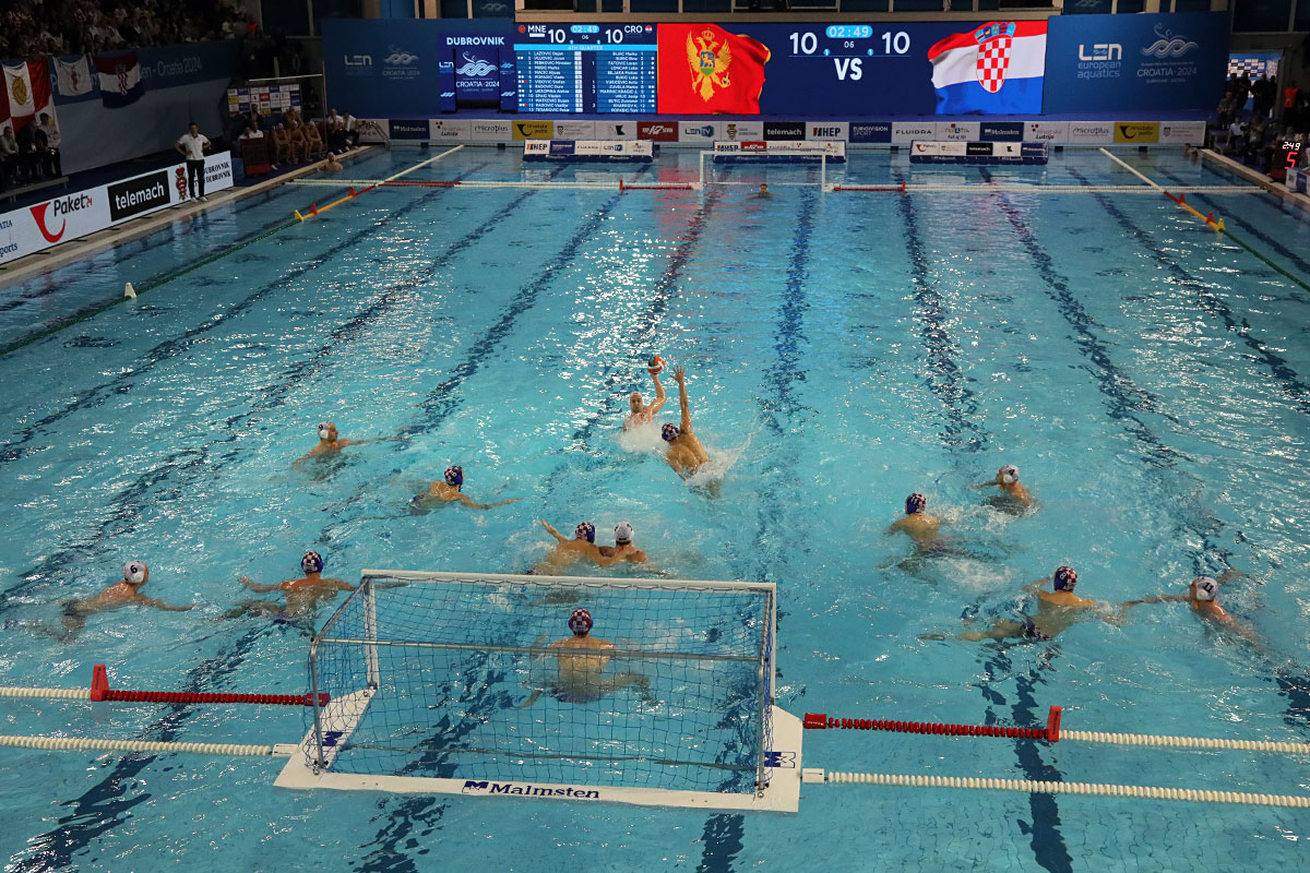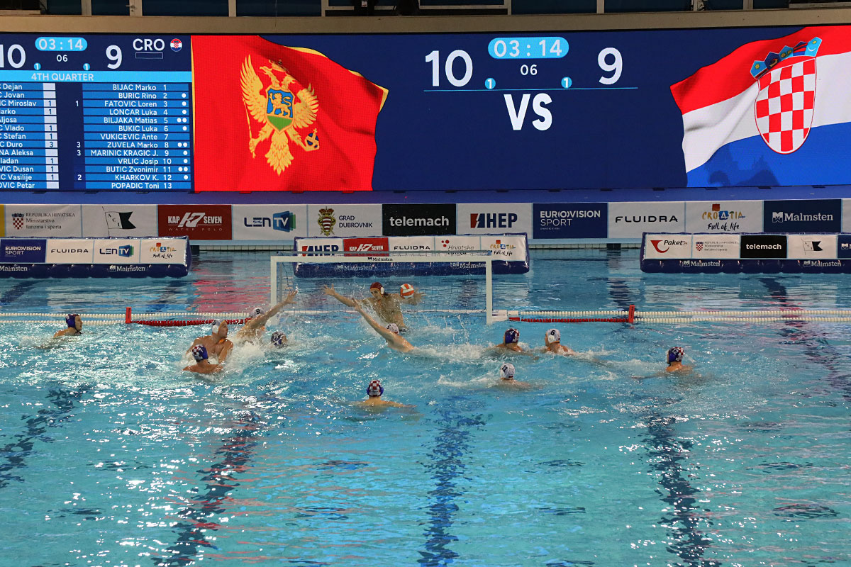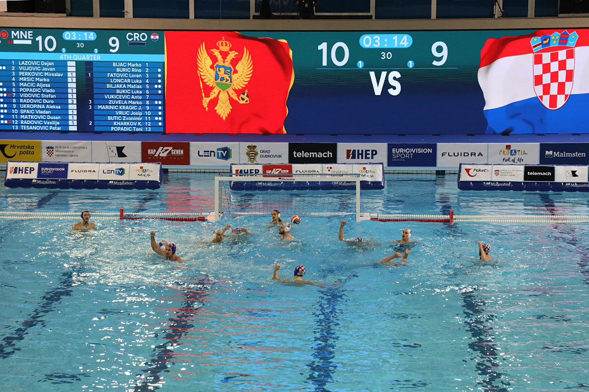Nakon odličnog otvaranja i vodstva 2:0 u užarenom grotlu tribina gruškog bazena, Hrvatska opet kao i protiv Španjolaca pada u drugoj četvrtini kada Crnogorci preokreću na 6:5 i ima vodstvo od 9:7, ali tri uzastopna gola Crnogorcima pred sam kraj donose prednost od 9:10. Dvije minute prije kraja, kod 10:10 Crna Gora je zbog brutalnosti suđene Vladi Popadiću ostala do kraja susreta s igračem manje, ali Fatović iz peterca gađa gredu. Nije nas išlo ni ju zadnjem napadu, kada kod rezultata 11:11 ne koristimo dva igrača više i utakmica odlazi u u raspucavanje peteraca.