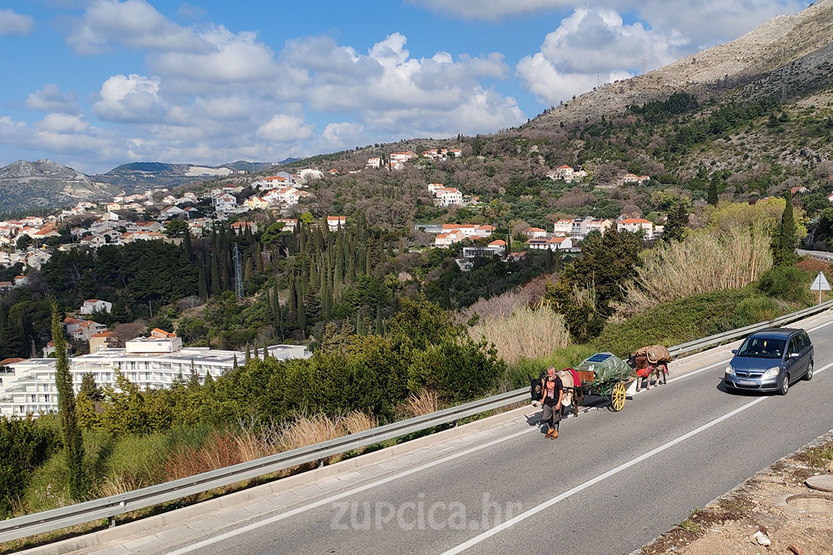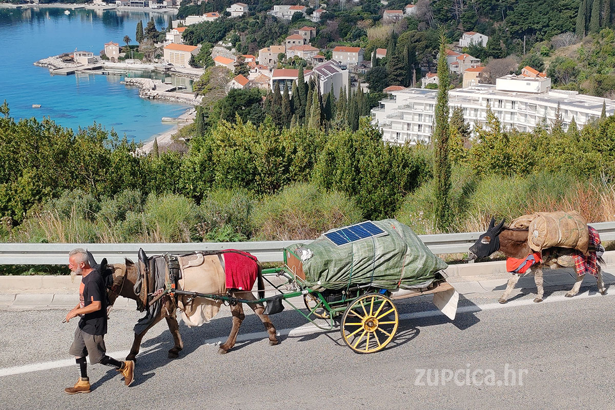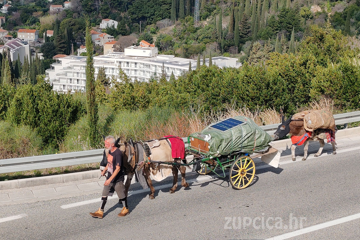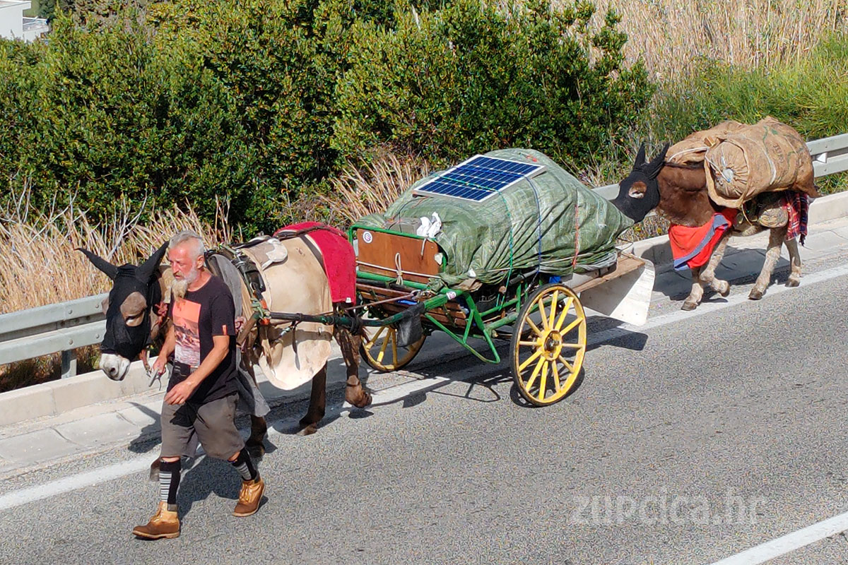 Naime, prometnicom se kretao putnik koji je uz pomoć dva magarca vukao mala zaprežna kola natovarena opremom. Putnik je hodao uz životinje i vodio ih uz rub kolnika, dok su kola bila prekrivena ceradom, a na vrhu se mogao vidjeti i mali solarni panel.