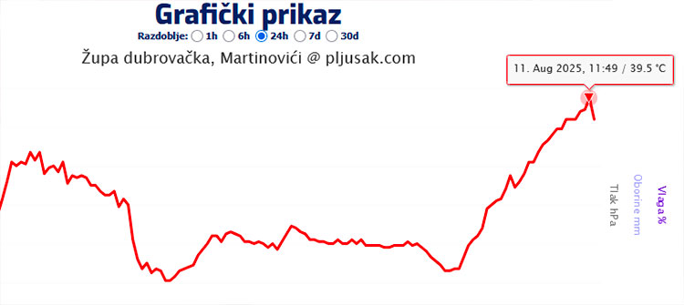 Prema podacima sa župskih Automatskih meteoroloških postaja ovaj ponedjeljak je najtopliji dan ovoga ljeta, temperatura u Martinovićima u 11:49 sati je bila 39.5°C, a u Kuparima je najtoplije bilo u 11:02 kada je izmjereno 39°C.