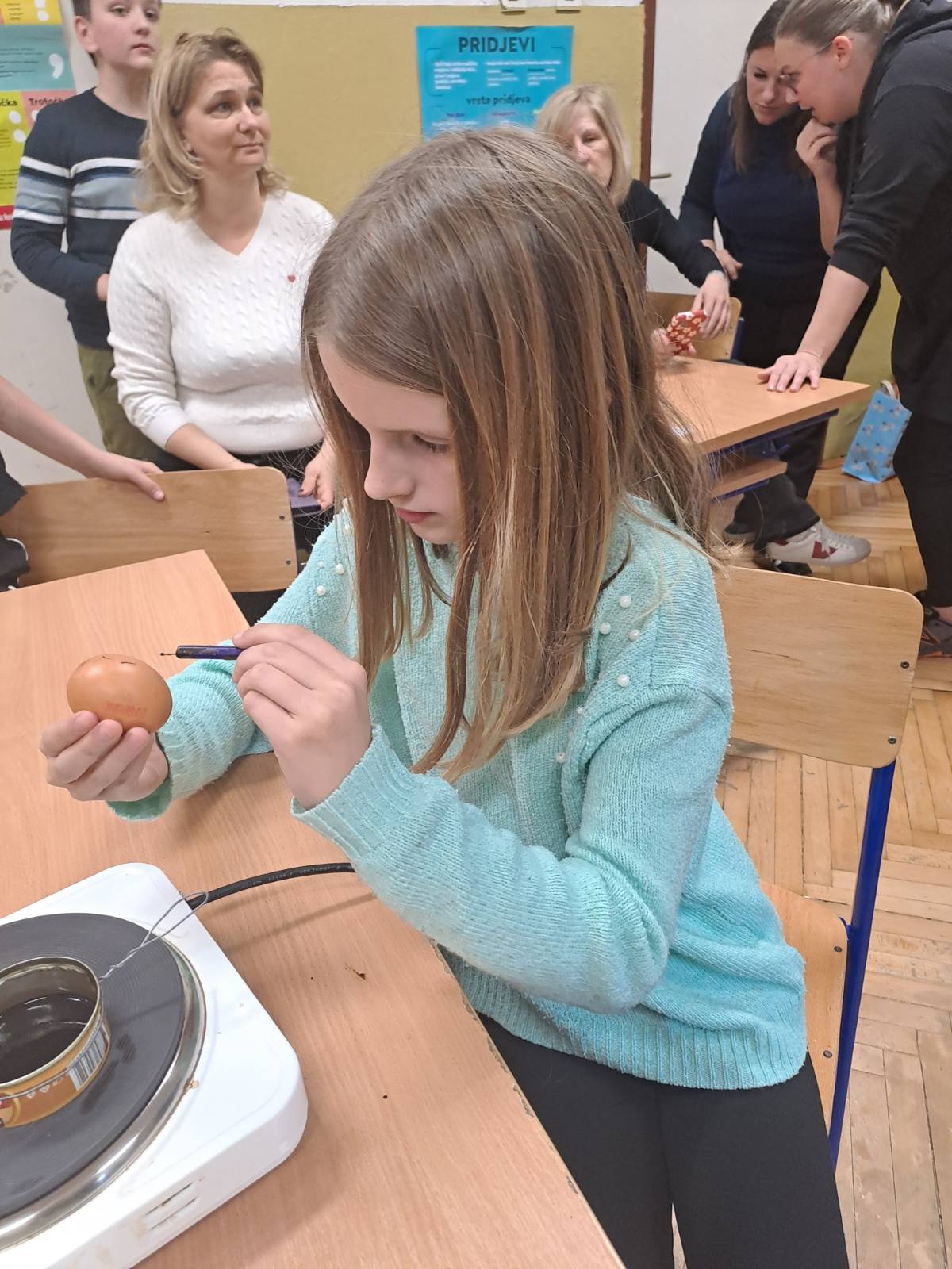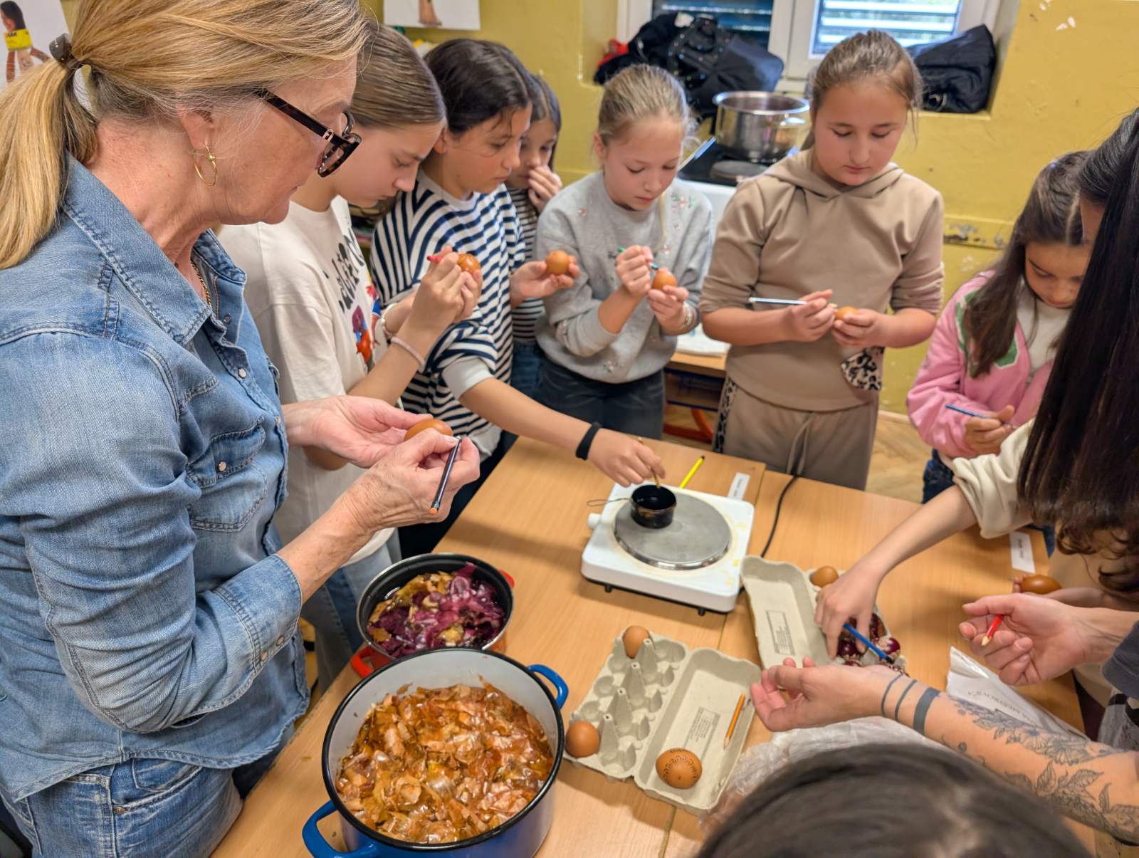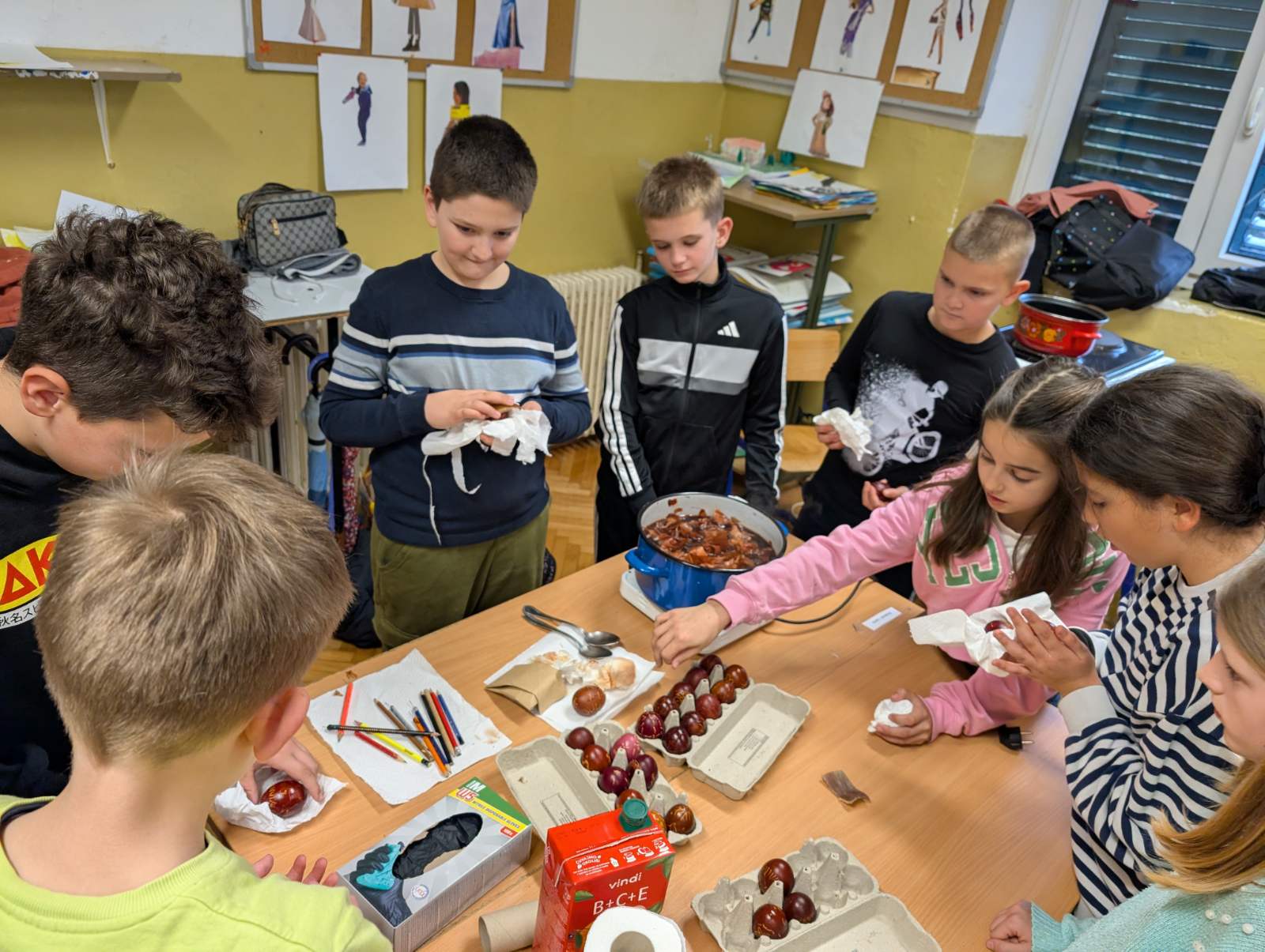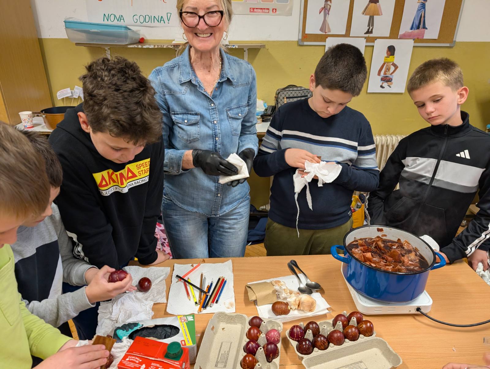 Kako fina motorika, kreativnost, strpljenje i mašta, nije nigdje nestala kod ovih naših digitalnih domorodaca, vidljivo je bilo jučer, kada su naši mali Župljani s velikom pažnjom i interesom pratili svaku riječ naše none Ljube. Vrlo strpljivo, a da se skoro niti jedno jaje nije slomilo, uspješno su iscrtavali prepoznatljive uzorke na svježim jajima. Sva su jaja, naravno završila u „lučinu“, koju smo danima skupljali, a kako bi jaja dobila završni sjaj, kora pancete je bila najpopularniji gadget u našoj učionici.