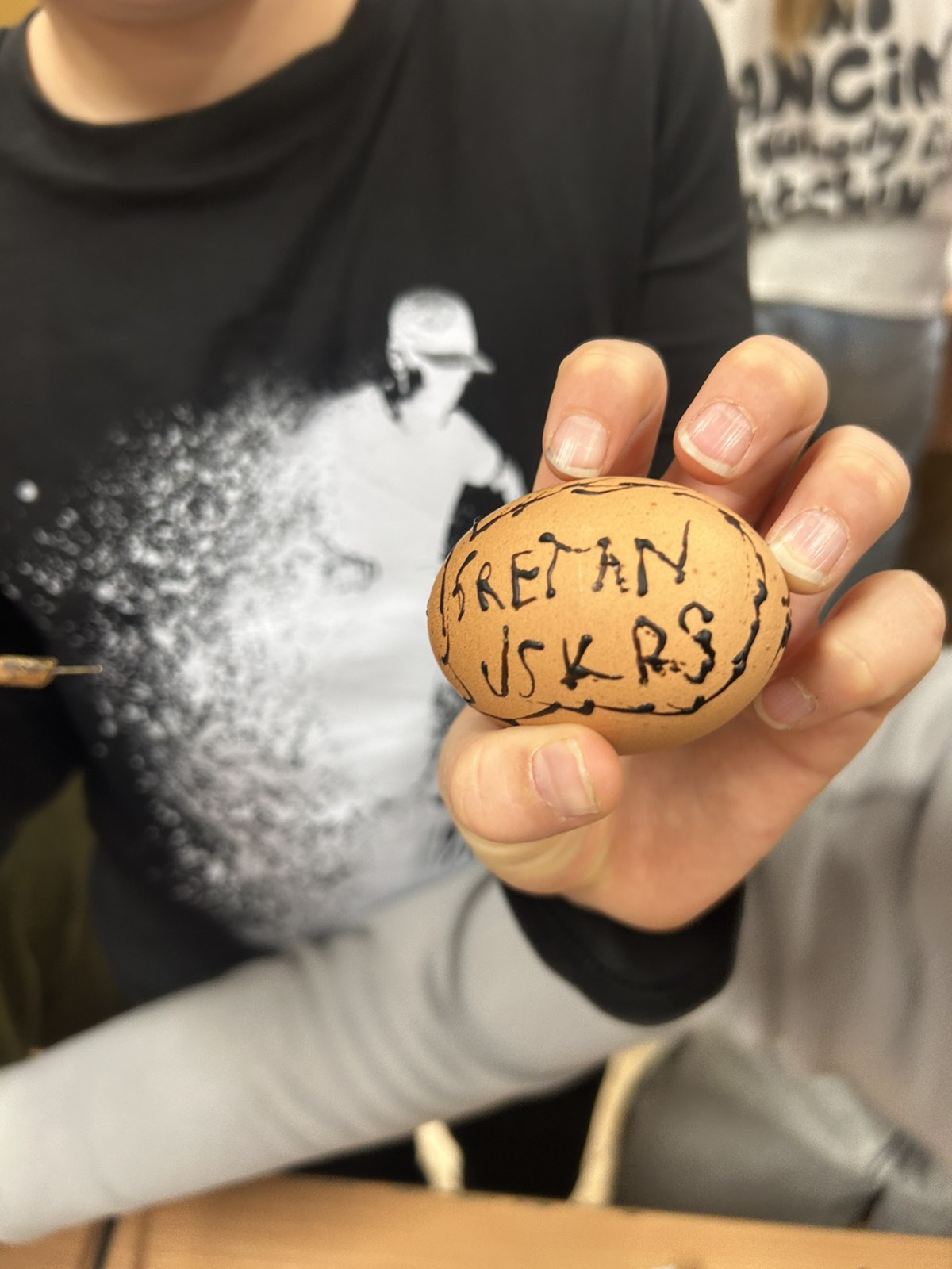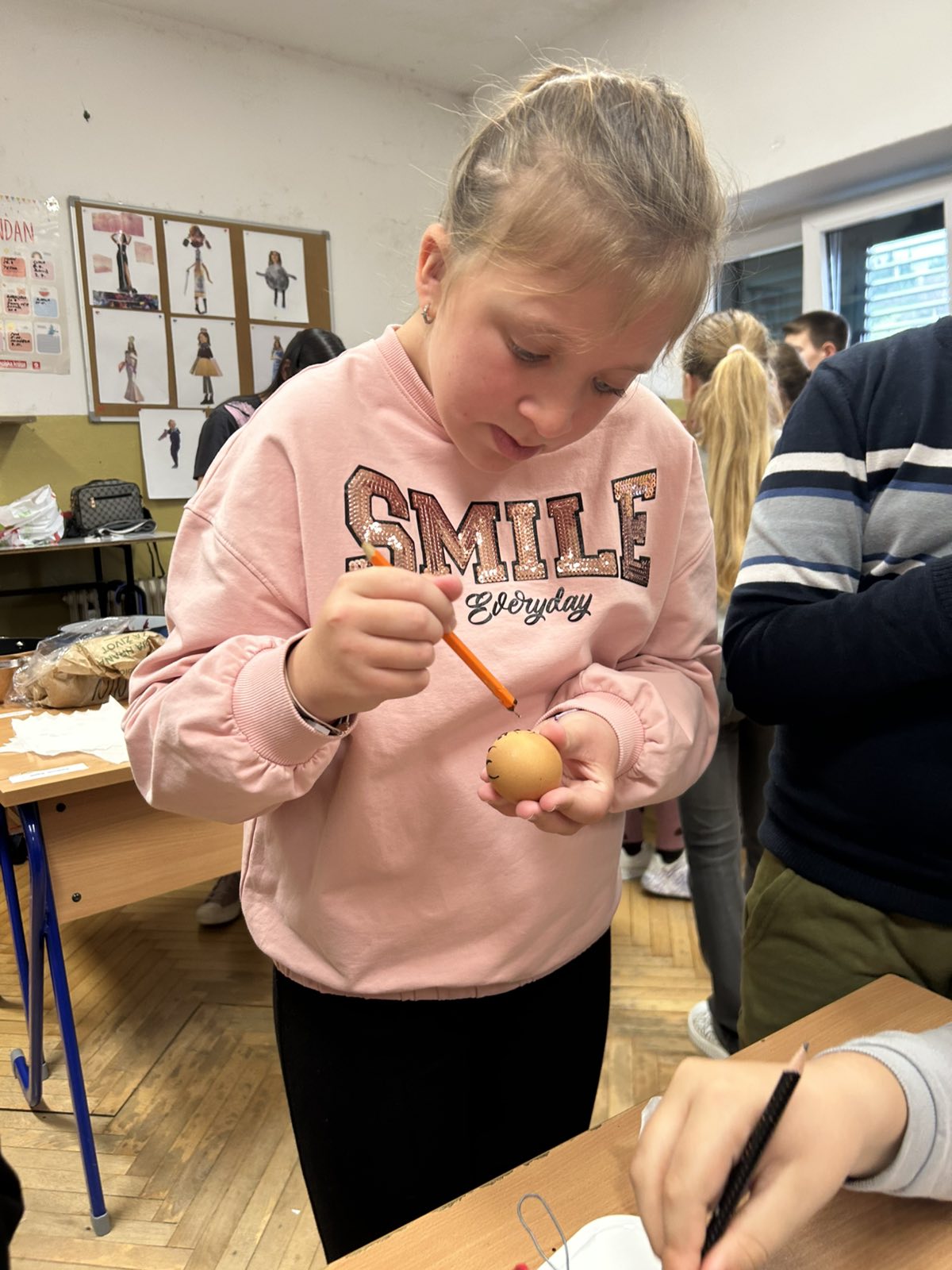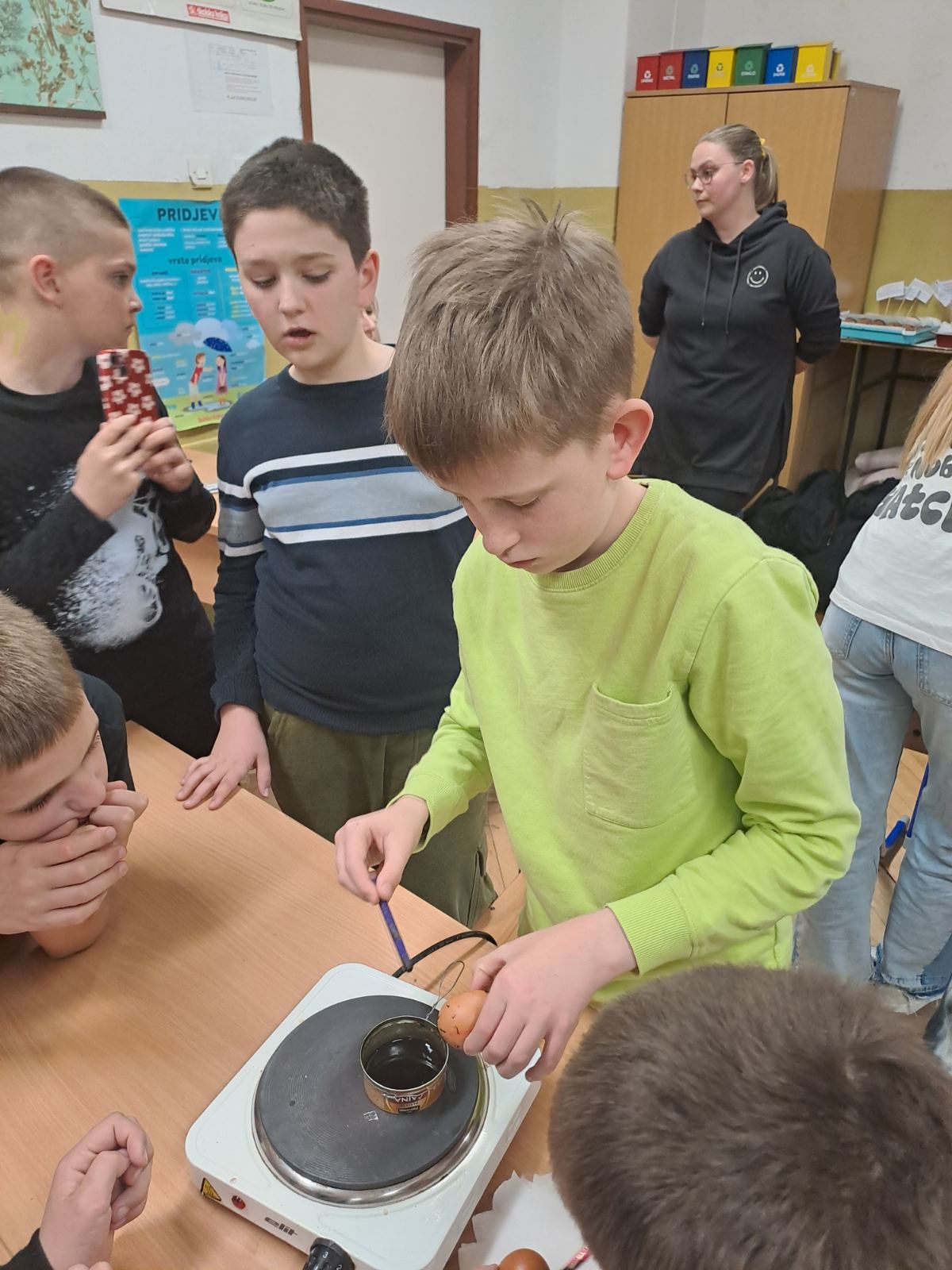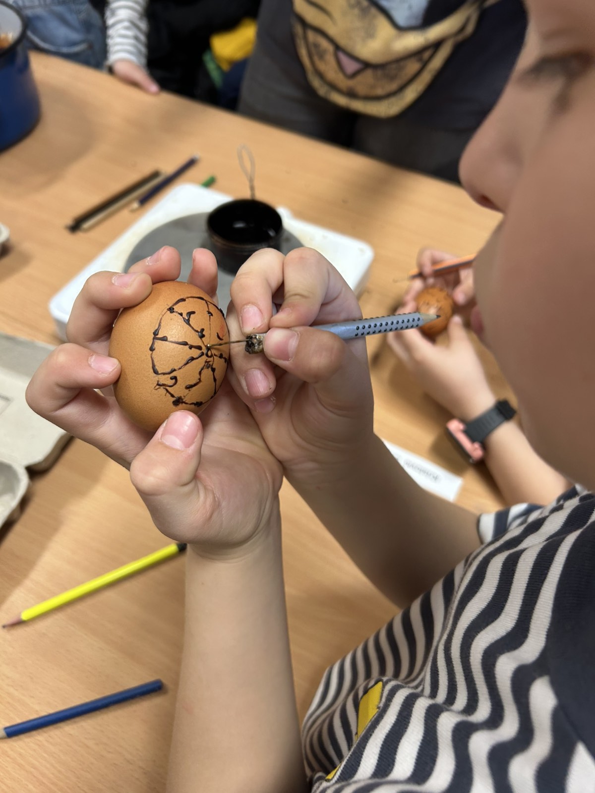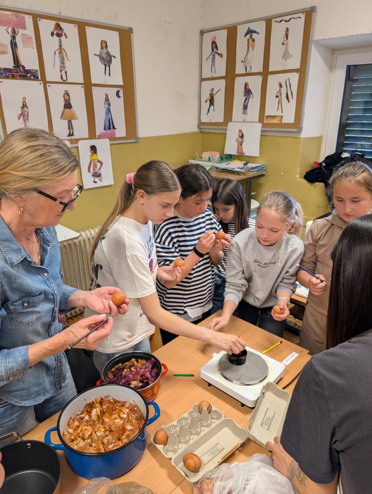 Kako fina motorika, kreativnost, strpljenje i mašta, nije nigdje nestala kod ovih naših digitalnih domorodaca, vidljivo je bilo jučer, kada su naši mali Župljani s velikom pažnjom i interesom pratili svaku riječ naše none Ljube. Vrlo strpljivo, a da se skoro niti jedno jaje nije slomilo, uspješno su iscrtavali prepoznatljive uzorke na svježim jajima. Sva su jaja, naravno završila u „lučinu“, koju smo danima skupljali, a kako bi jaja dobila završni sjaj, kora pancete je bila najpopularniji gadget u našoj učionici.