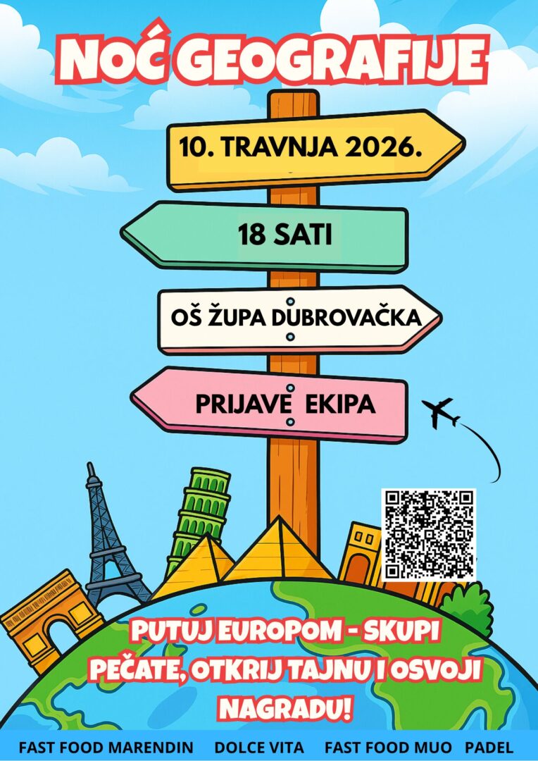 Iz osnovne škole Župa dubrovačka pozivaju učenike i ljubitelje geografije na zanimljiv i edukativan događaj – Noć geografije, koja će se u župskoj školi održati 10. travnja 2026. godine s početkom u 18 sati.