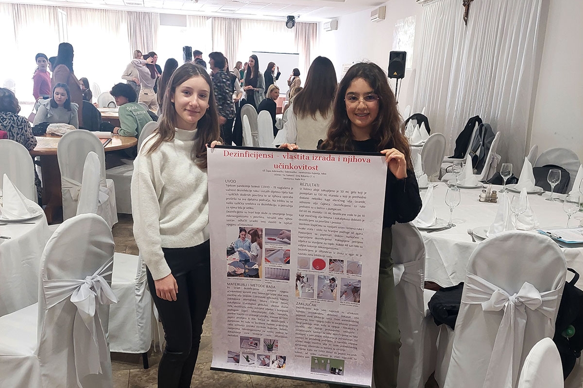 Rad na zadanu temu pod nazivom Dezinficijensi – vlastita izrada i njihova učinkovitost, članice tima Ema Bokarica i Tia Tomović napravile su uz primjenu praktičnih vještina i znanja stečenih u nastavi biologije kao i izvannastavne aktivnosti Biosigurnost i biozaštita. Učenice su, koristeći dostupna prirodna sredstva, napravile dezinficijense koje su primijenile na kulture uzgojenih mikroorganizama te tako dokazale njihovu učinkovitost. Svoj rad su prezentirale putem postera, a napravljene dezinficijense povjerenstvo je imalo priliku i probati. Povjerenstvo je rad predložilo za Državnu smotru. Mentorica učenicama je bila učiteljica Nada Prce.