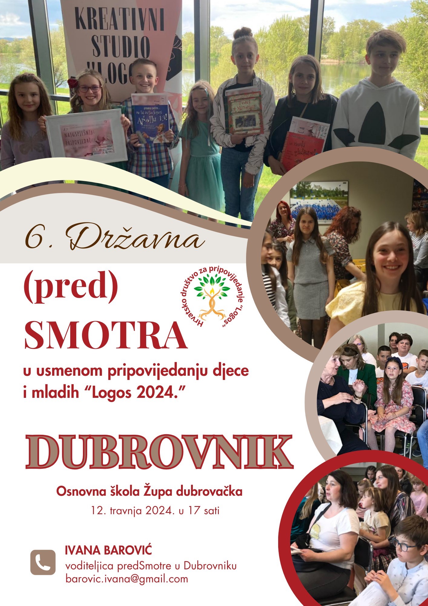 U petak, 12. travnja u 17 sati Osnovna škola Župa dubrovačka bit će domaćin 6. Državnoj (pred)Smotri u usmenome pripovijedanju za djecu i mlade “Logos 2024.” Voditeljica predSmotre za Dubrovačko područje je učiteljica župske škole Ivana Barović.