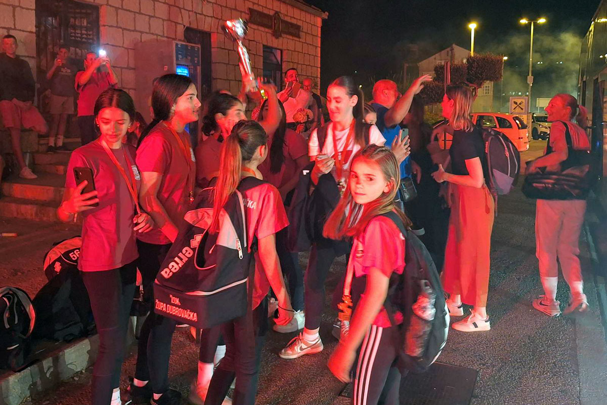 Brojne Župke i Župljani, roditelji i prijatelji, suigračice te novi općinski načelnik Marko Miloslavić, ravnateljica škole Lukrecija Pavlović i predsjednik ŽOK Župa dubrovačka Miran Miloslavić dočekali su večeras na Mljekari mlade župske odbojkašice Državne prvakinje u kategoriji učenica 5. i 6. razreda.